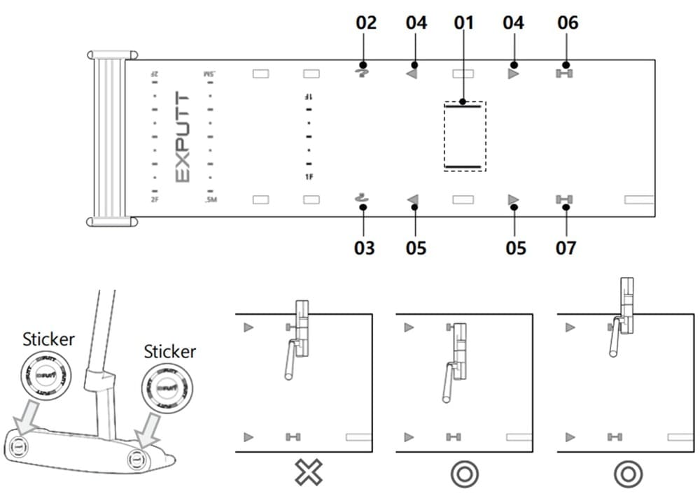 Stickers need to be attached to the putter face for control key input and accurate detection of the putter path when putting. Make sure to attach stickers on each end of the putter face (heel and toe) as shown in the picture below. If you locate the putter on the printed control key (for 1~2 seconds), the relevant function will be performed. The control keys are only recognized when the ball is in the Ready zone.